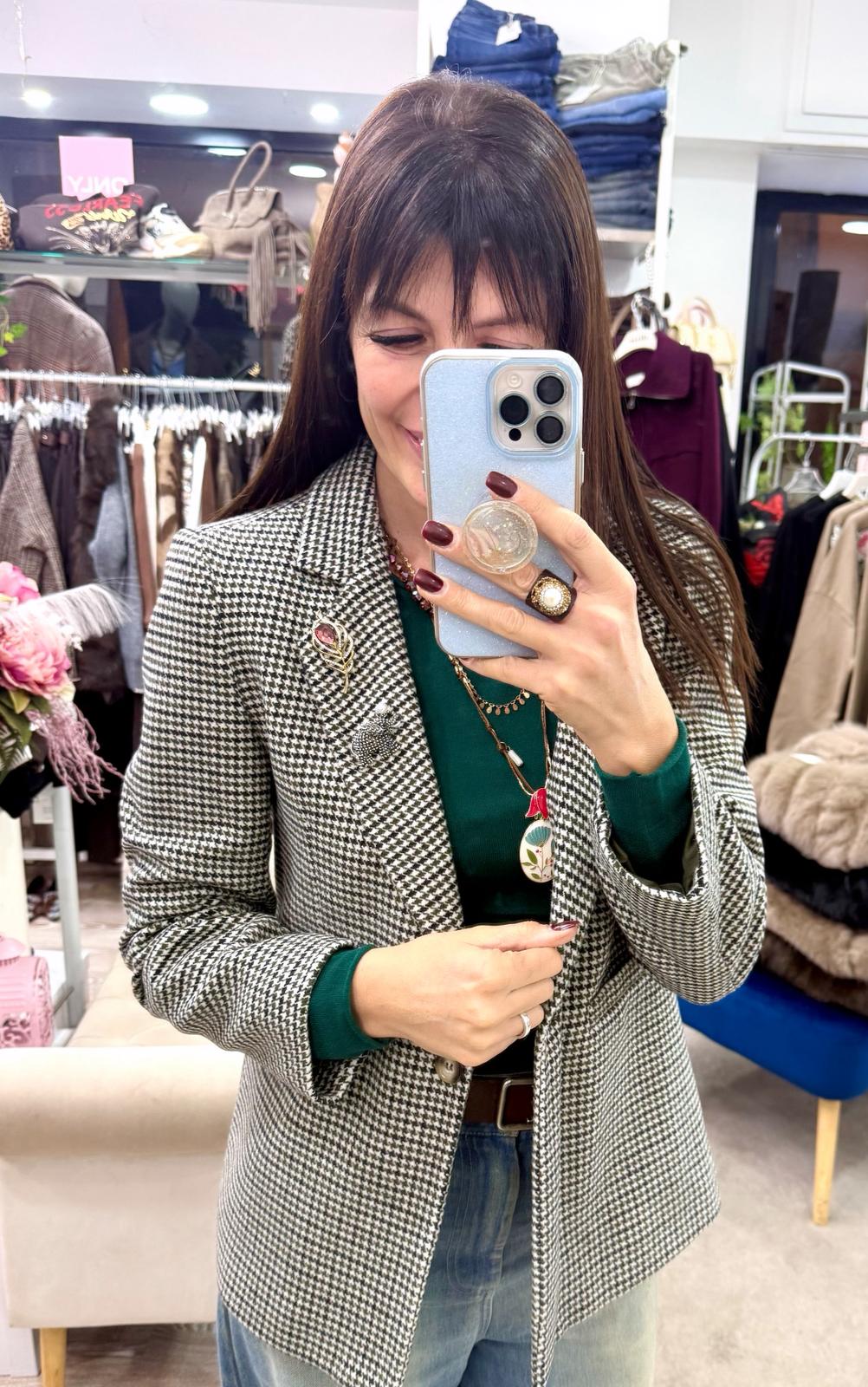 Recensisci per primo “Blazer cappottino con spille in fantasia pied poule Susy Mix”