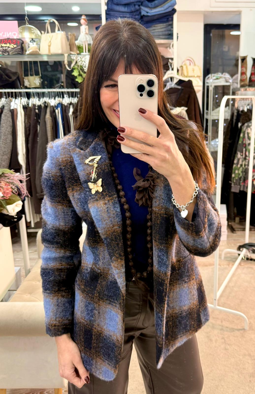 Blazer cappottino con spille del brand Susy Mix nel colore blu.