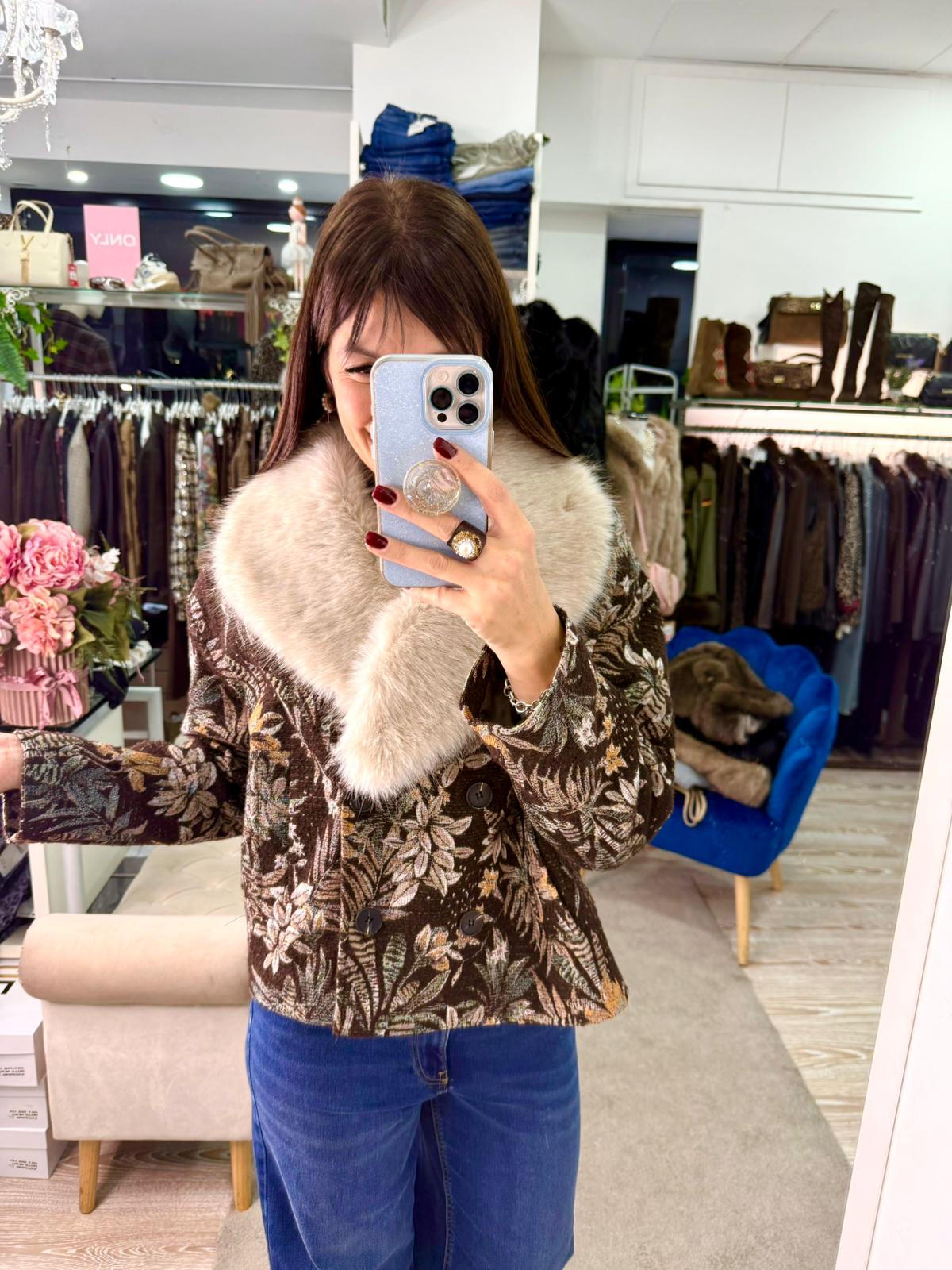 Blazer cappottino over, fantasia floreale con collo in eco fur removibile del brand Susy Mix.