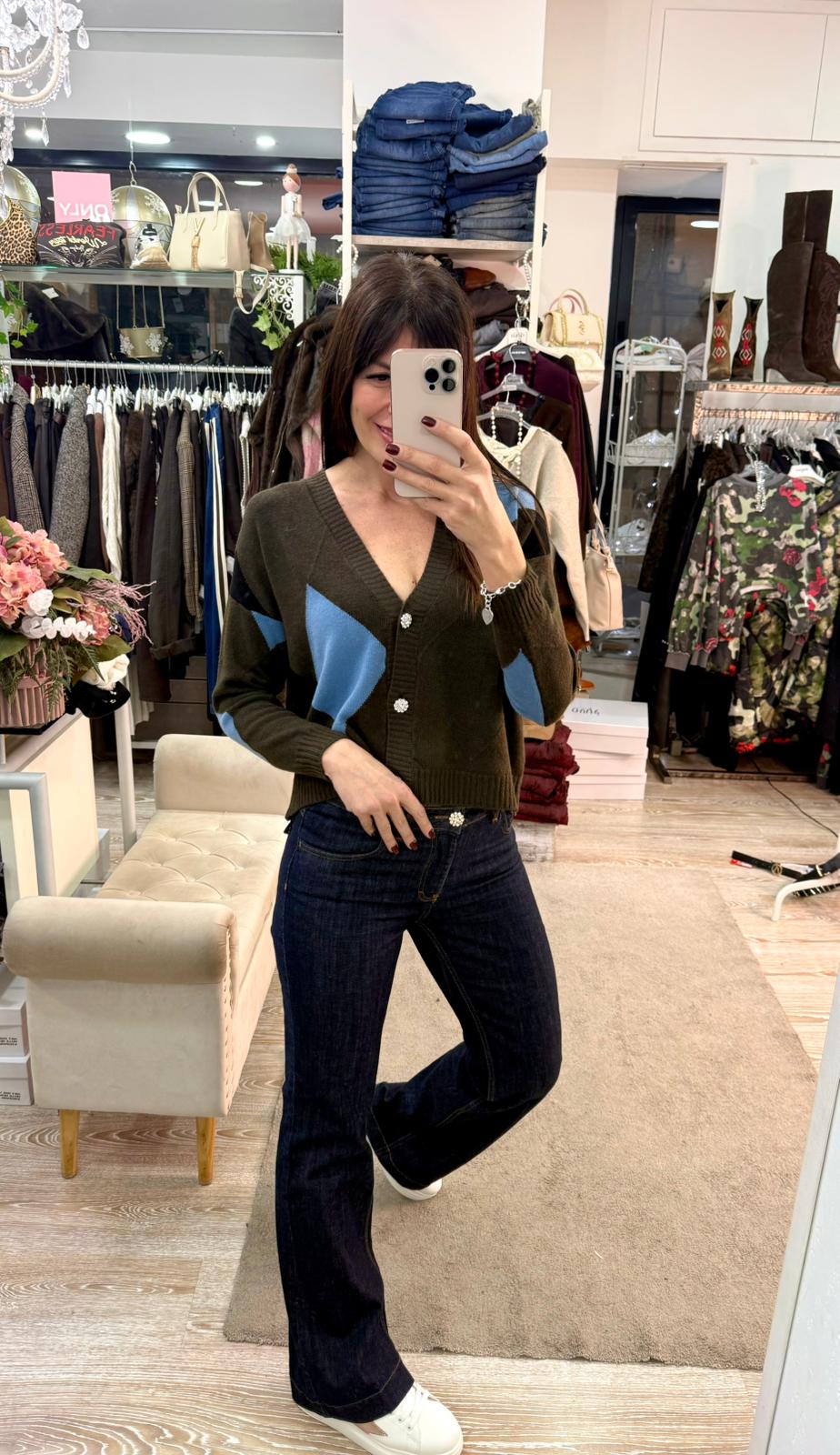 Jeans Susy Mix, modello flared con bottoni gioiello e taschino posteriore.