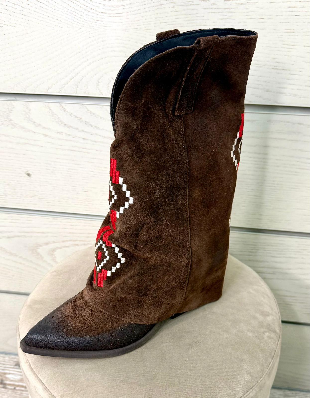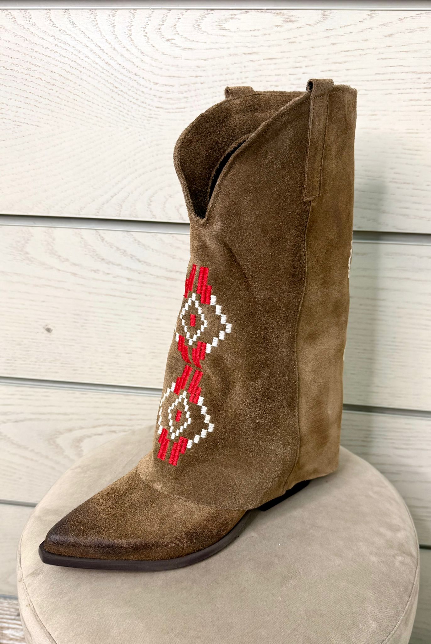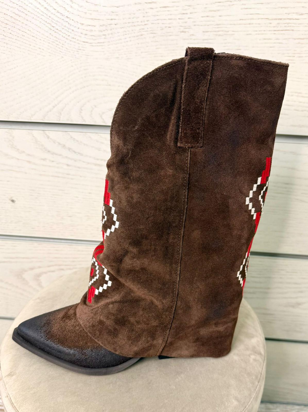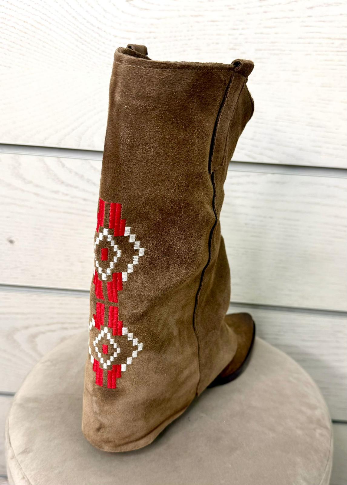 Texano vera pelle con ricamo a mano di Via Mondana, disponibili nel colore moro o camel.